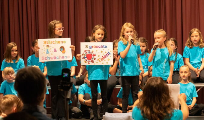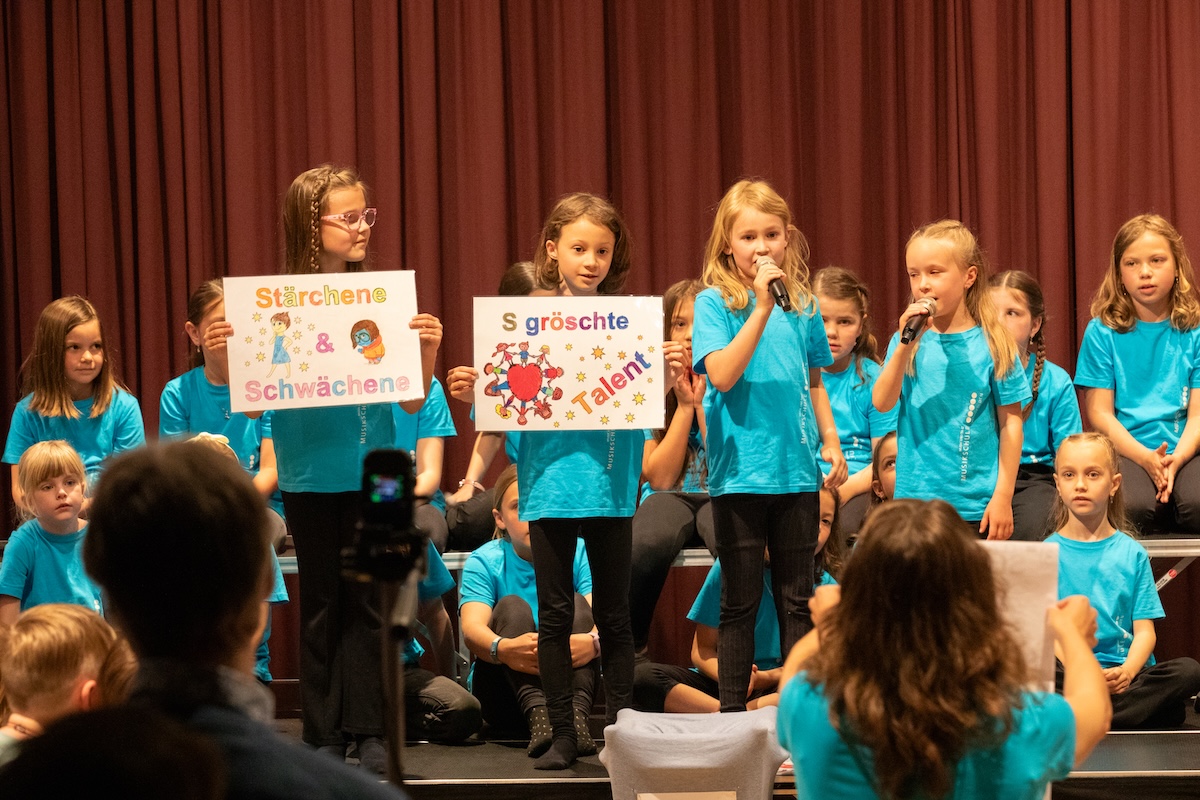 «Zum Glück simmer alli so verschide, doch vereint dur Begeischterig, wo in üs allne brennt. Jede isch wichtig, gspürsch es au, so hämmer Fride!» Die zitierten Liedzeilen stammen aus dem aktuellen Jahresmottolied der PS Berg: TALENTFABRIK aus der Feder von Chorspatzenmama Wetzel. Wenn alle ihre Talente entdecken, zeigen und sich dabei wertgeschätzt fühlen dürfen, ja, dies allein erschafft vielleicht noch nicht Frieden, aber es macht lebendig und glücklich und bereichert eine Gemeinschaft. Gestärkt durch das freudige Miteinander kündigten einige Chorkinder am Mikrofon die Lieder an, begrüssten und verabschiedeten das Publikum, andere engagierten sich beim Hochhalten der selbst bemalten Liedplakate und die Amseln, also die Chorspatzen mit Zusatztraining, berührten mit ihren mutigen und schönen Solostimmen.