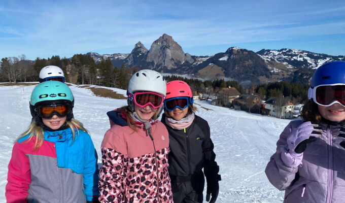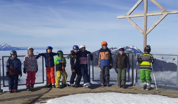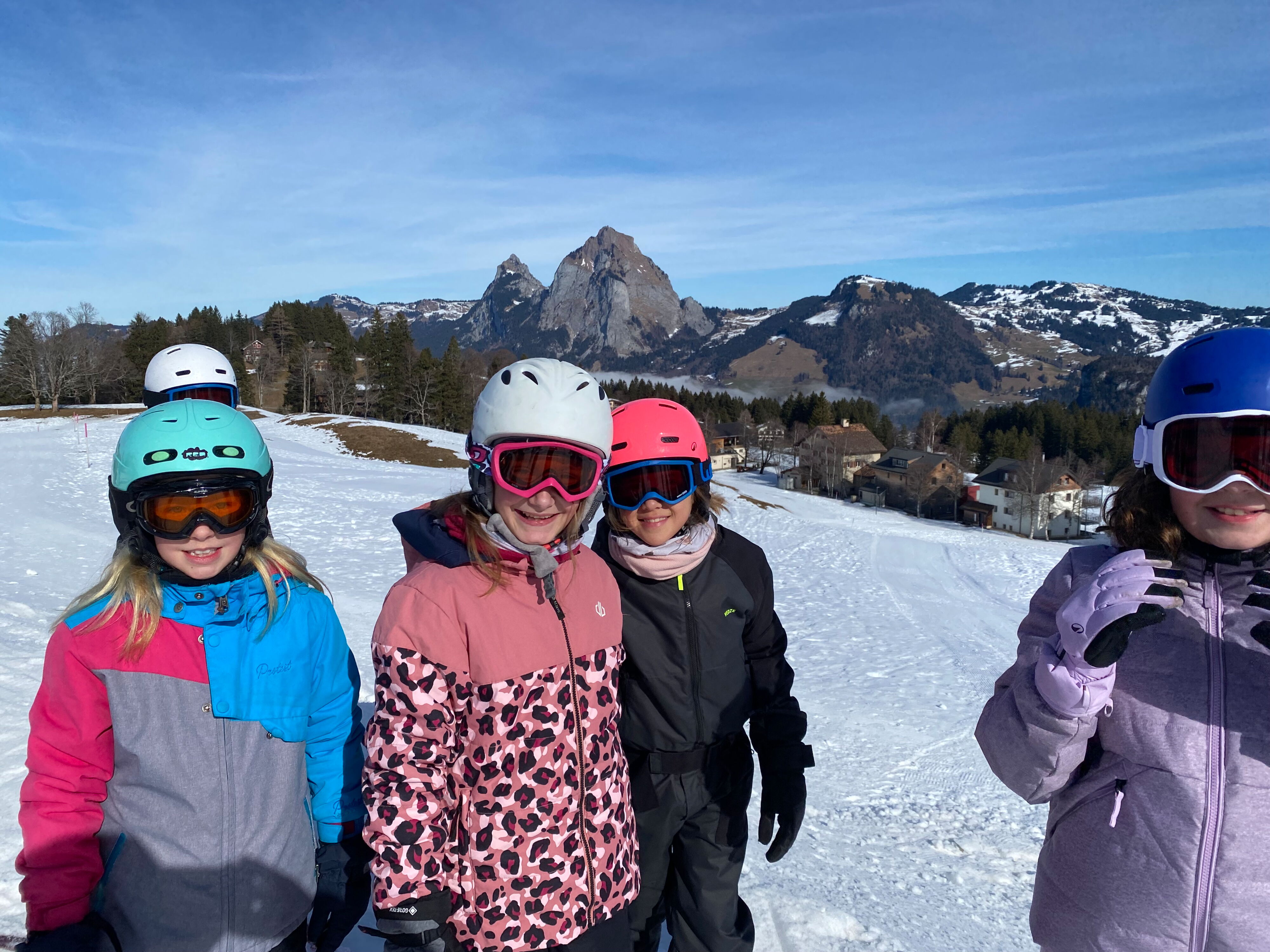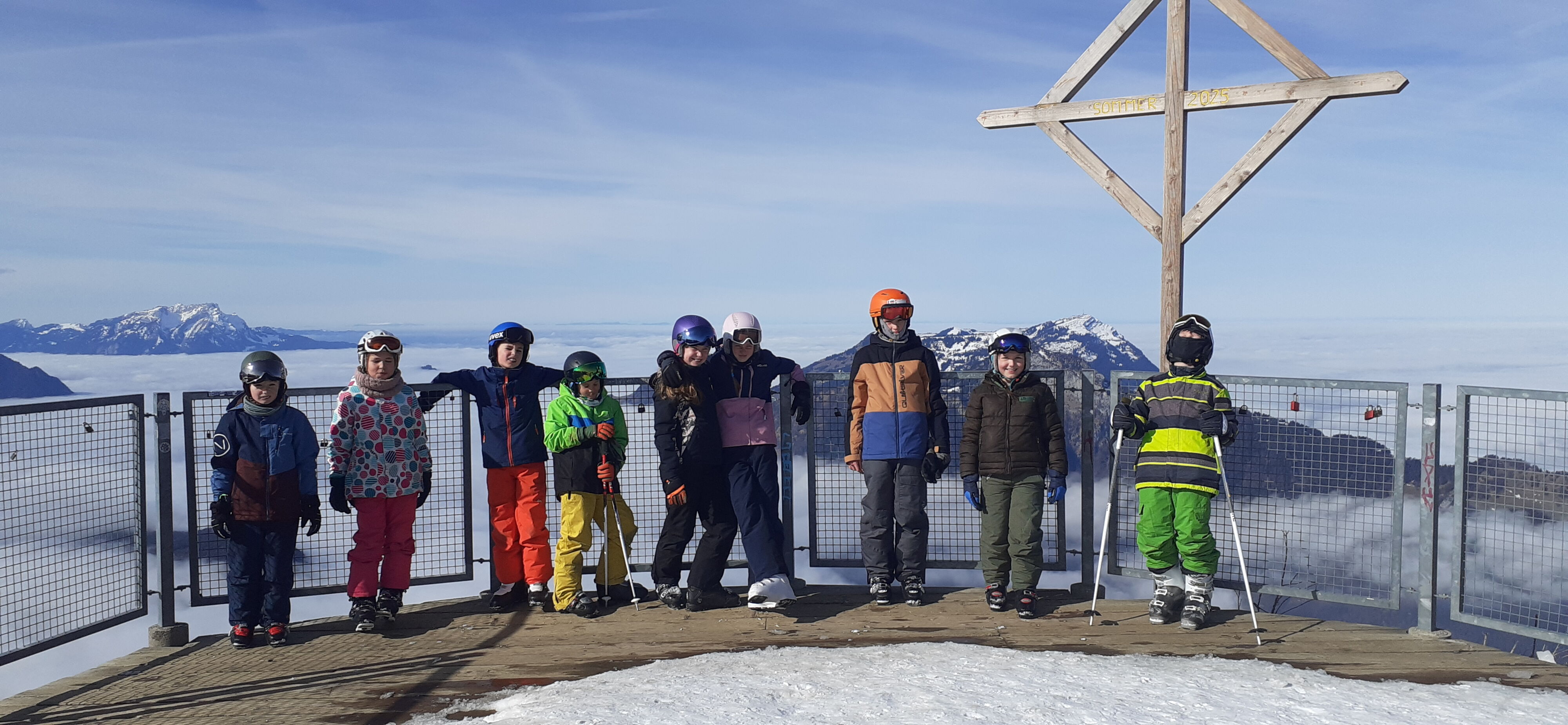 Die Anreise im Doppelstöcker-Bus war lang und cool. Das Umpacken in den Container war für manche eine Herausforderung, weil sie ihre Taschen nicht so gut organisiert hatten. Um 11 Uhr fuhren wir los mit der Stoosbahn. Nach dem Tunnel präsentierte sich uns die Sonne und wir hatten einen herrlichen Blick aufs Nebelmeer. Oben angekommen gingen wir auf die Ski und das Snowboard bis um halb eins. Hinter dem Haus assen wir unseren Lunch. Manche konnten es kaum erwarten sich wieder auf die Piste zu begeben.