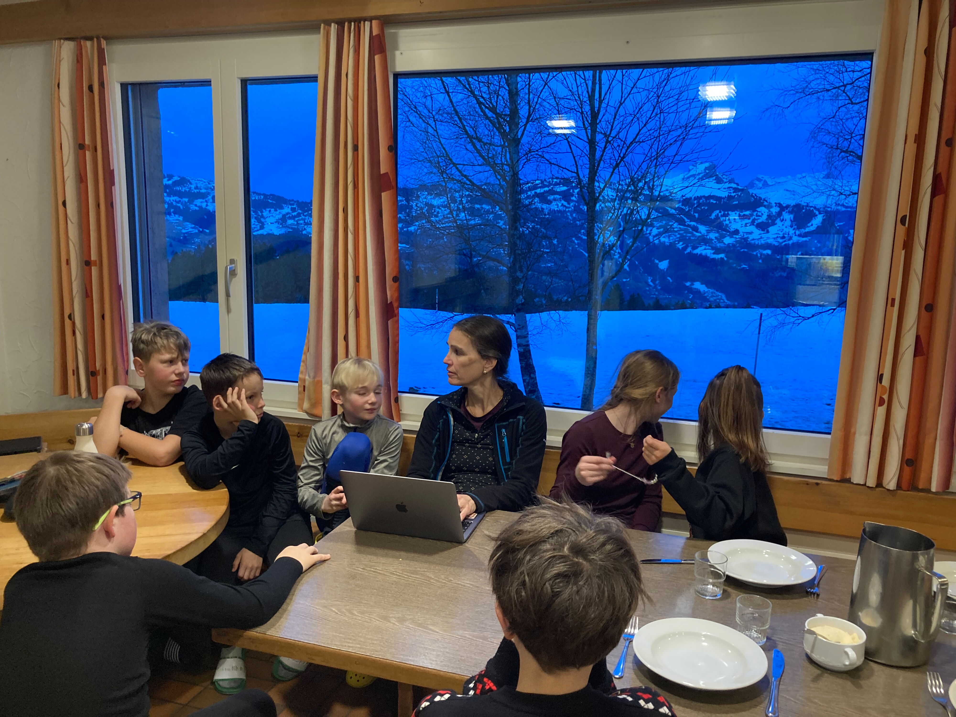 Zurück im Haus bezogen wir unsere Zimmer und dann gab es Zvieri. Jetzt sind wir am Schreiben, andere spielen Ping Pong und reden im Zimmer. Aus der Küche riecht es herrlich. En Guete.