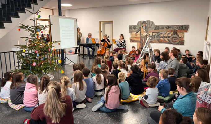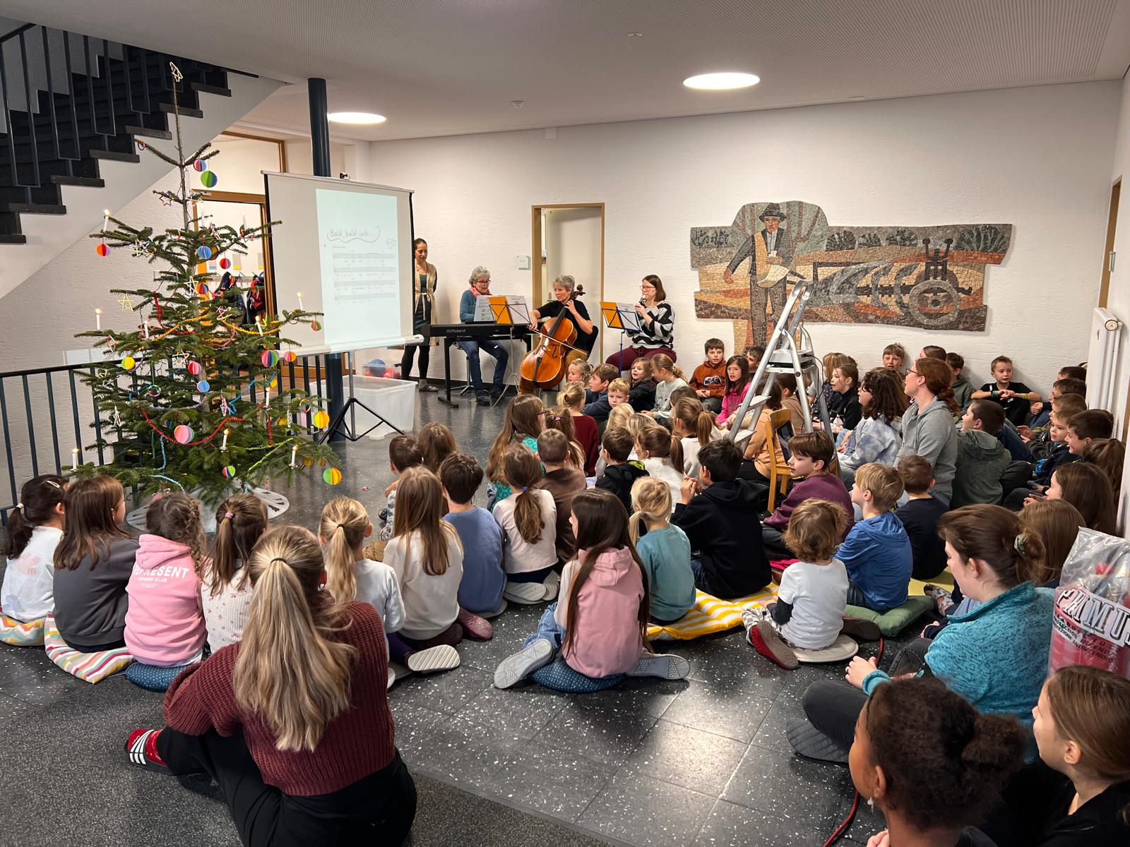 Immer montags im Advent trafen sich zu Beginn des Morgens alle Kinder und die Lehrerinnen zum gemeinsamen Singen im Foyer. Da erklangen Lieder wie «De Gritibenz», «Bald, bald isch Wienacht», «Was soll das bedeuten» und viele mehr. Der Gesang wurde von drei Lehrerinnen mit Klavier, Cello und Blockflöte begleitet.